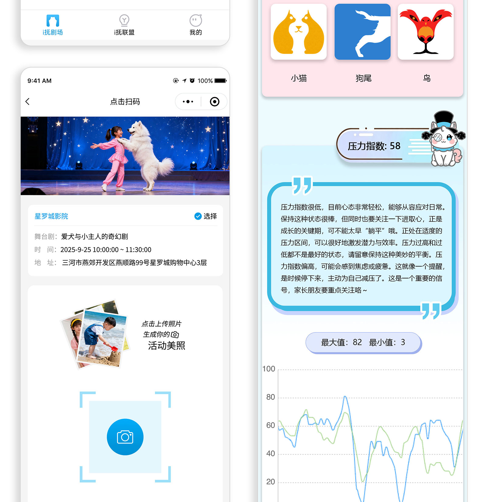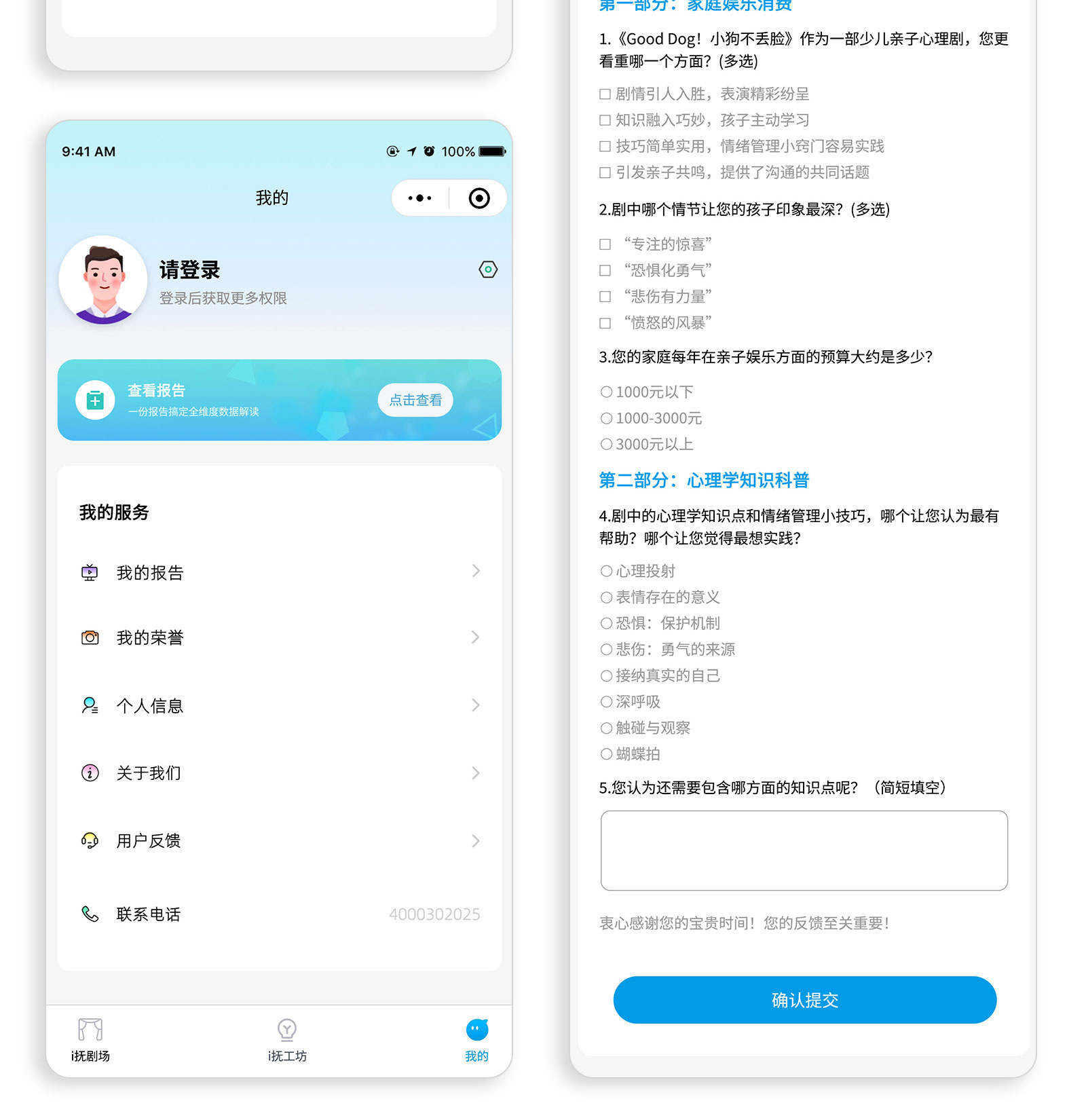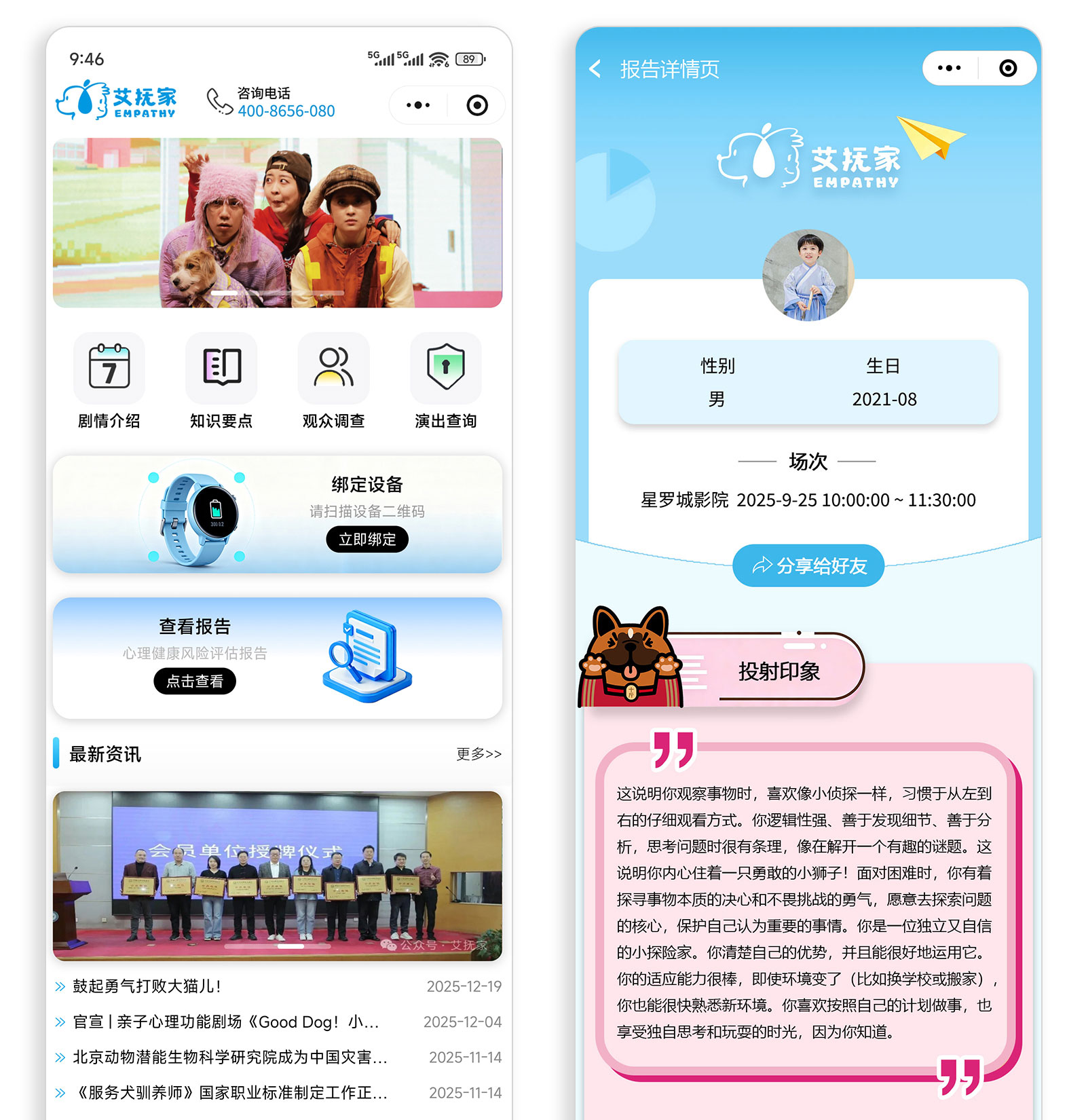 小程序首页,剧情介绍,知识要点,观众调查,剧情查询,会员中心等功能,孩子们通过看话剧,绑定设备,生成数据报告。