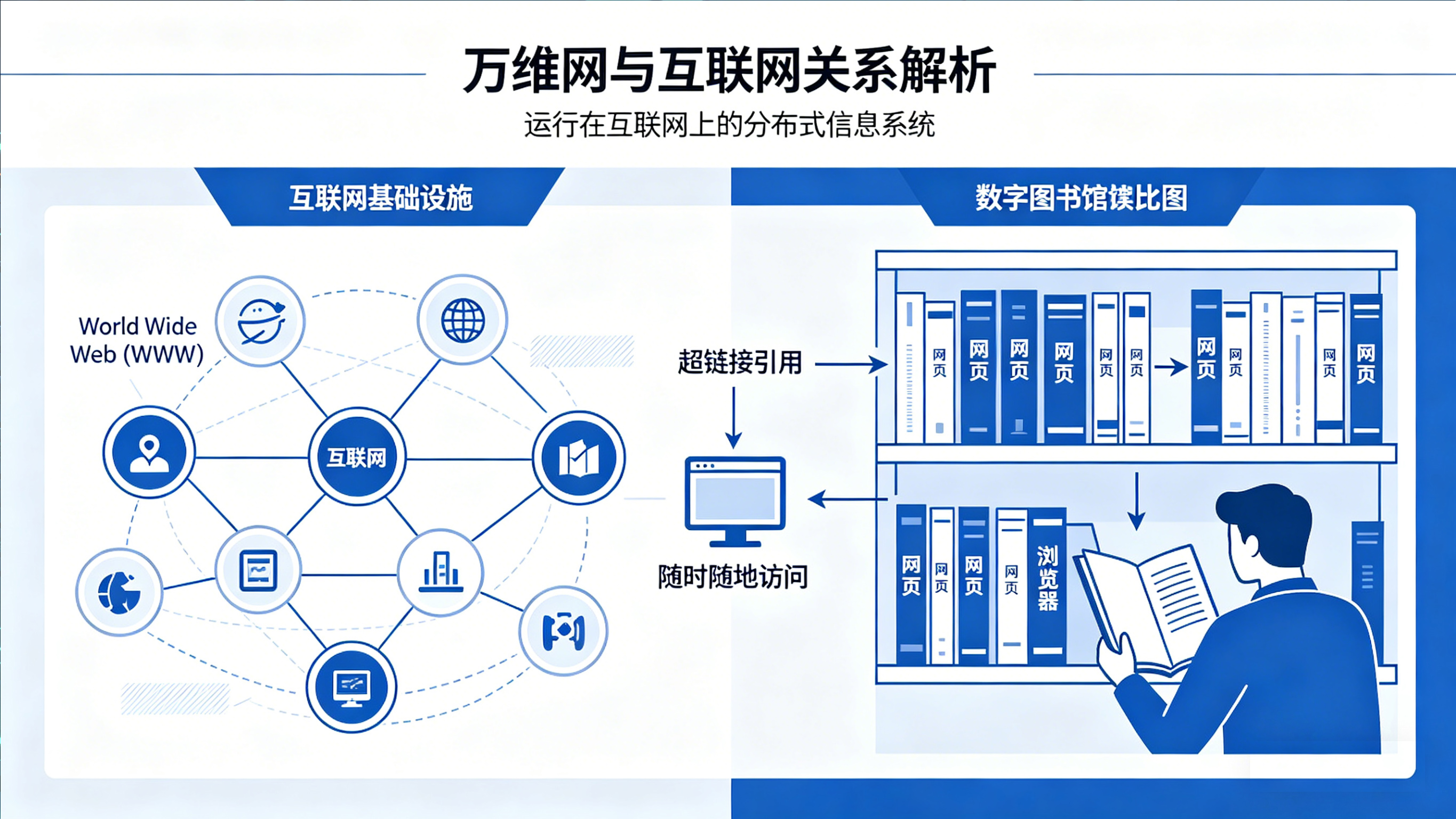 北京小程序开发也需要万维网(World Wide Web,简称 WWW 或 Web)并不是互联网本身,而是运行在互联网之上的一套巨大的分布式信息系统。可以把它理解成一座覆盖全球的“数字图书馆”:每一本书就是一个网页,书之间通过超链接互相引用,而我们可以用浏览器随时随地翻阅。